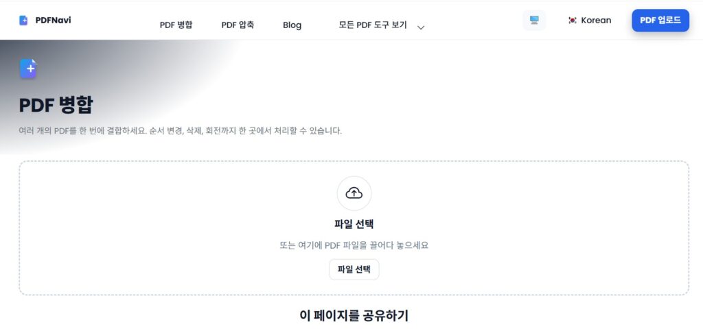 여러 PDF를 동시에 업로드하기 ㅡ 한꺼번에 여러 개의 PDF 파일을 선택하여 업로드할 수 있습니다. 각 파일의 모든 페이지가 빠르게 로드되어 하나의 작업 공간에 표시되며, 작업 도중에도 추가로 파일을 더 올리는 것이 가능합니다.