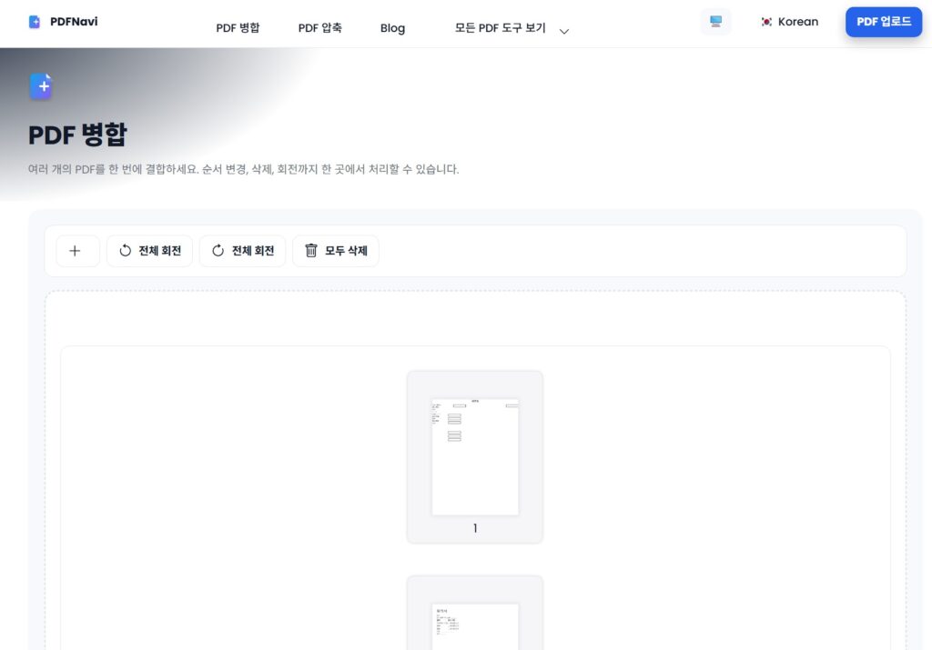 또한, 병합하기 전에 불필요한 페이지가 있다면 해당 썸네일을 선택한 뒤 휴지통 아이콘 등의 삭제 기능으로 제거할 수 있으며, 페이지 방향이 잘못된 경우 좌우 회전 버튼을 눌러 올바르게 돌릴 수 있습니다.